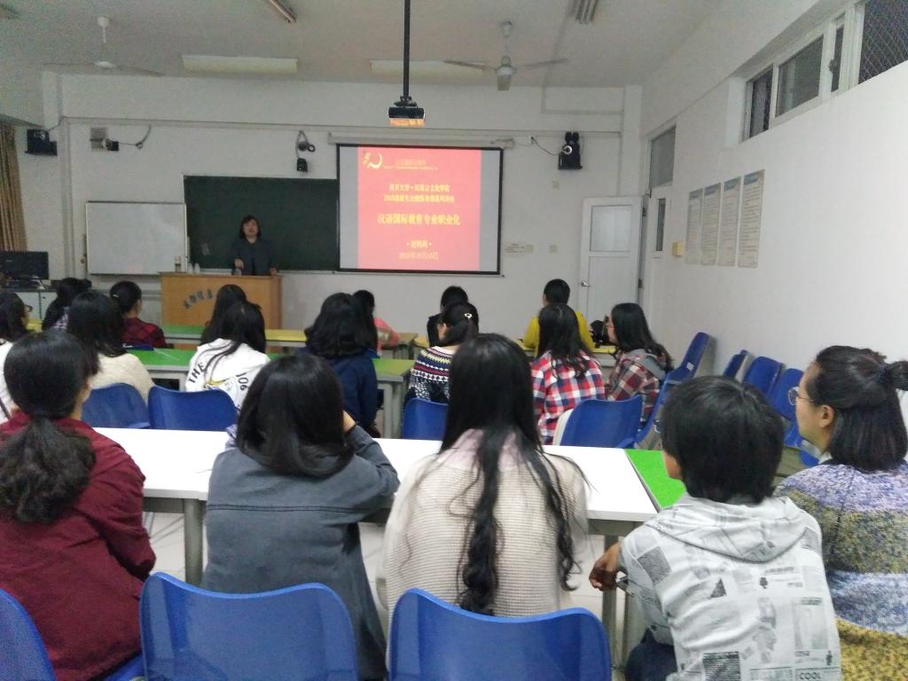 行业认知教育:11月9日,学院邀请了北京汉友通国际教育咨询有限公司的教学总监赵鹤莉老师做了题为“汉语国际教育专业职业化”的讲座。赵老师结合自己多年的从业经验从“什么是对外汉语教学”、“对外汉语教学的行业现状和要求”、“从事汉语国际教育相关工作应具备的素养”三个方面进行阐述。赵老师用风趣幽默的语言和丰富的案例告诉同学们,到中国学习汉语的外国留学生来自世界200多个国家和地区,且人数正稳步增长,此行业市场潜力巨大、前景良好,希望同学们要努力学习专业知识,积极参加实践,不断积累教学经验,为今后传播中华文化奠定坚实基础。