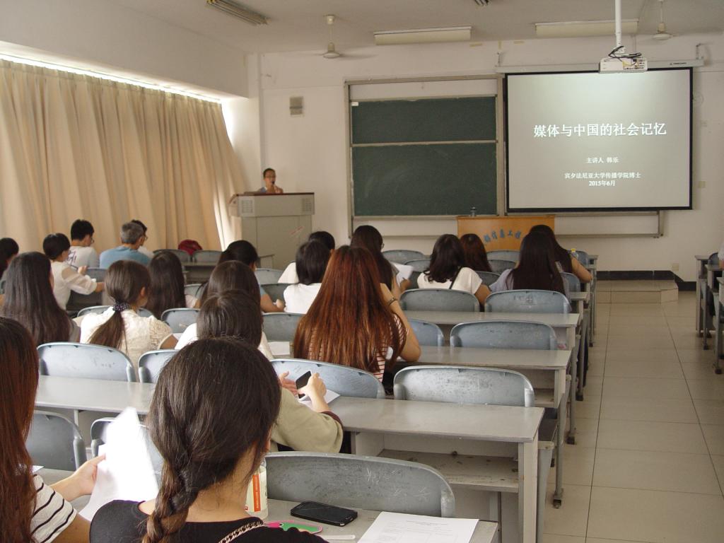 6月19日下午2:00,为了加强国际化的学术交流,培养专业学生对新闻传播学的国际素养,伟德国际1946源于英国邀请美国宾夕法尼亚传播学院韩乐博士在龙泉校区第一教学楼1205教室,举办了题为“新媒体与中国的社会记忆”的专题学术讲座。讲座由《新闻采访与写作》、《新闻采编实践》课程老师谢明香教授主持。汉语言文学专业2014级全体学生聆听了讲座。
