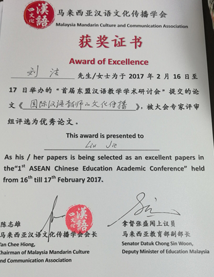 大会主要就东南亚华文教育、马来西亚华语教学的新定位和新功能、语言要素教学研究、文化教学与跨文化交际研究、语言政策与汉语国际传播、汉语国际教育的现状、问题与挑战、文化教学与跨文化交际研究、新媒体与汉语国际教育等问题进行了大会主题发言和分组讨论。刘洁老师提交的《国际汉语教师的文化认知和文化传播》论文在分组讨论中获得了专家和参会代表的好评,并被评为大会的优秀论文。