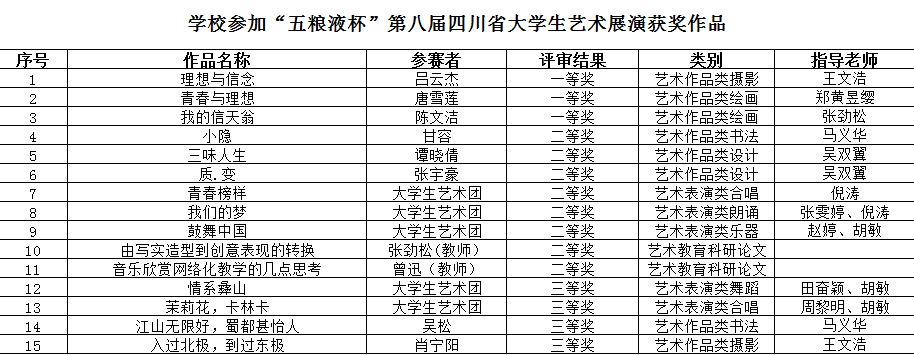 8月21日至26日,由四川省教育厅主办、自贡市人民政府协办的“五粮液杯”四川省第八届大学生艺术展演活动在四川理工学院举行。经过激烈角逐,学院推选的张劲松、王文浩、吴双翼、郑黄昱缨4位老师指导的作品共有6件获奖,其中一等奖3项、二等奖2项、三等奖1项。