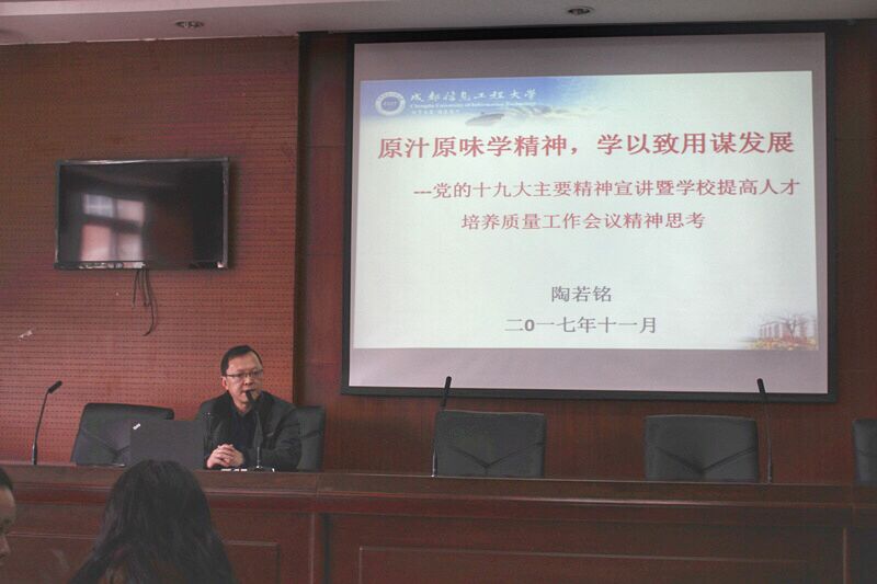 大会重点学习宣传了党的十九大主要精神,党总支书记陶若铭以“原汁原味学精神,学以致用谋发展”为主题,从党的十九大主题、十个方面历史性成就、四个重要判断、历史使命与四个伟大、十四条基本方略、九个方面理论分析和政策指导等方面进行了宣讲。大会还结合学院实际,对学校提高人才培养质量工作会议精神进行了思考解读。大会希望全体教职工提高站位、认清定位,以学促行、以行促改,精准发力、履职担当。大会要求学院班子、党支部、教研室、各班要组织好学习,对党的十九大精神要真学细悟,学深学透、加强宣传,形成学习成果。大会号召全体教职工要把思想和行动统一到党的十九大精神上来,带着问题学、联系思想学、结合实际学,根据各自学科专业领域,围绕十九大报告提出的新思想、新判断、新战略、新目标搞好教学科研,服务社会服务学校服务学生,不忘初心、牢记使命,担负起立德树人的时代重托,把智慧和力量凝聚到学院各项工作中来,推动学院健康有序和谐发展。