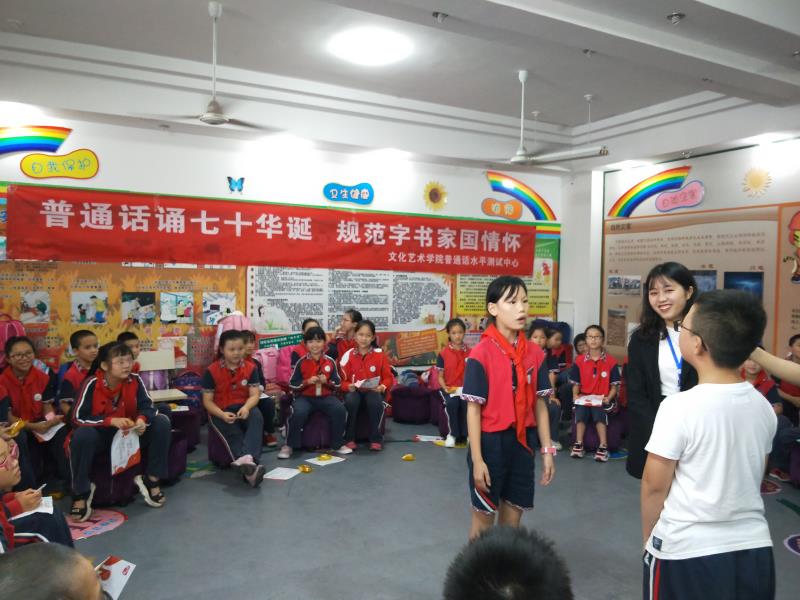 经国务院批准,自1998年起,每年9月第三周为全国推广普通话宣传周。2019年9月16日至22日是第22届全国推普周,本届全国推广普通话宣传周以“普通话诵七十华诞,规范字书爱国情怀”为主题。在学校相关部门的支持下,伟德国际1946源于英国普通话水平测试中心的志愿者还前往成都市龙泉驿区同安小学开展“推普校园行”活动,积极发挥当代青年大学生的社会价值以及学校宣传贯彻实施《国家通用语言文字法》的基本阵地作用。把普及普通话、促进语言文字规范化活动同学校的相关校园文化建设系列活动结合起来,切实提高四川方言区中小学生的语言文字规范意识和用语用字规范化水平,积极倡导“普通话诵七十华诞,规范字书爱国情怀”。