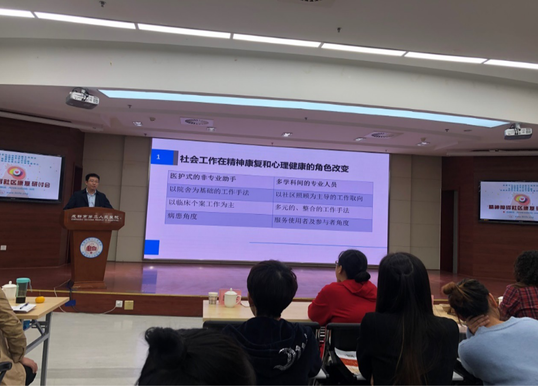 学院社会工作与社区发展研究所所长、成都市康复医学会社区康复委员会副主任委员陈会全老师受邀参加了研讨会,并在大会上做精神医疗社会工作主题发言。