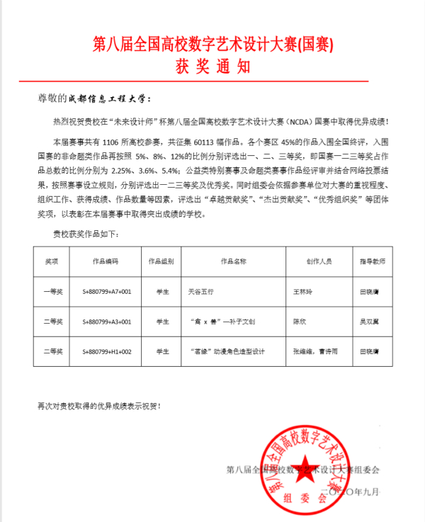 近日,第八届全国高校数字艺术设计大赛(NCDA大赛)国赛评审工作落下帷幕。由我校伟德国际1946源于英国田晓膺、吴双翼老师指导的学生作品,经过西南片区赛和国赛的层层选拔,荣获国赛一等奖1项、国赛二等奖2项。这是我校学子首次参加该项赛事并取得可喜的成绩,也刊登在中共中央宣传部学习强国网站。