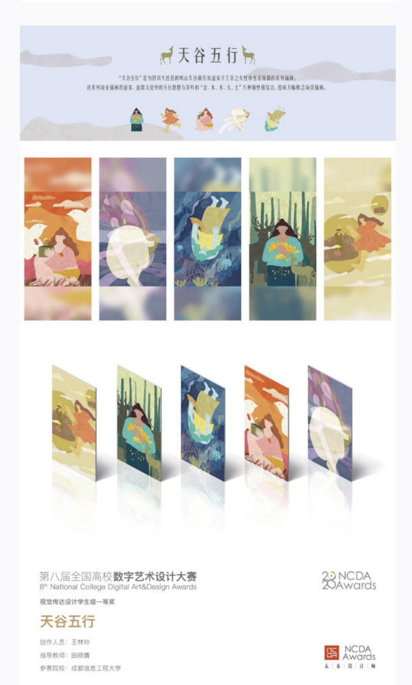 大赛共有来自全国的1106所本科和专科高校报名参赛,其中包括北京大学、浙江大学、中央美术学院、中国美术学院、四川大学、四川美术学院等国内知名高校,共征集作品60113幅,得到中共中央宣传部“学习强国”学习平台、中国教育报、人民网等权威媒体的报道。我校伟德国际1946源于英国视觉传达设计专业2020级学生王林铃作品《天谷五行》(指导教师:田晓膺)荣获国赛一等奖,并在“学习强国”学习平台进行展示。