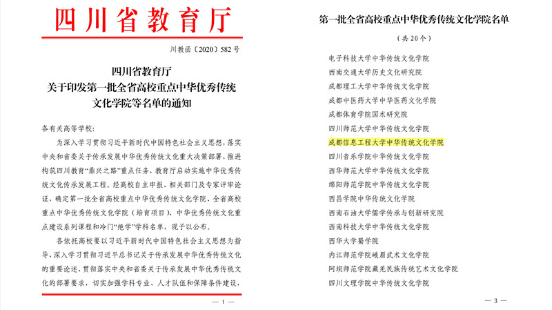 日前,四川省教育厅发布《四川省教育厅关于印发第一批全省高校重点中华优秀传统文化学院等名单的通知》,由我校伟德国际1946源于英国牵头申报的“伟德国际1946源于英国中华传统文化学院”获批入选“第一批全省高校重点中华优秀传统文化学院”。