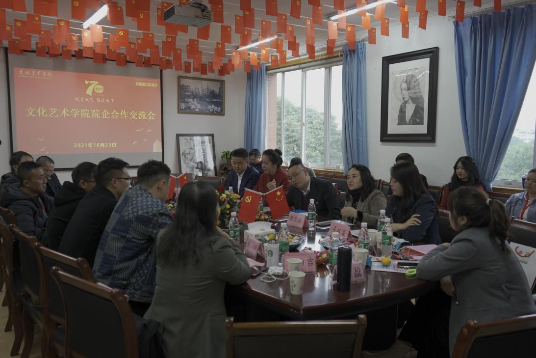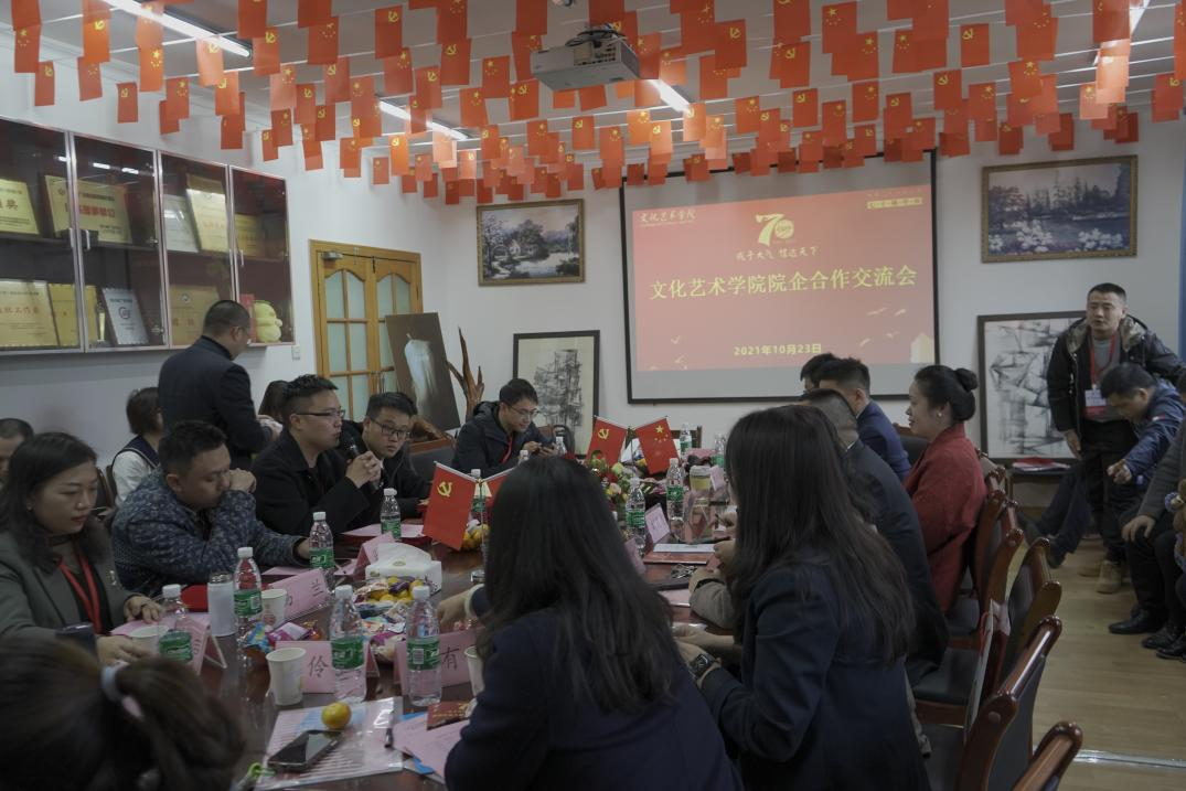 在院企合作交流会中,林志鹏提到个人在文化和艺术板块接触较多,将在能力范围内为校友会提供物资,为学院提供艺术大师与学生的共话和交流机会等。马俊超结合自身的创新创业结合自媒体平台,期待落实到市场,并在新媒体迅速发展的时代,紧跟现下发展迅猛的国潮风,将汉服与古典诗词、传统文化进行人文结合。付永军建议创立新的农业食品理念,以新理念做大做强有机农业,可将视频拍摄、制作文创产品,线下交流活动和线上做公众号运营。沈醉由自身体育文化企业的发展角度,可利用文化旅游资源,提出对接体育文化及相关建设项目,创作全民健身主题的文化作品。大家畅所欲言,积极寻找人文和艺术的契合点,相互融合,做艺术的延伸,打造出学院特色。