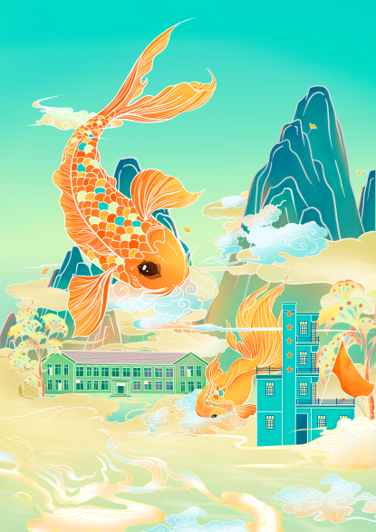 《遇成信,筑嘉华》系列绘画作品分为三个部分。第一部分,作品将我校前身西南军区气象干部训练时期的标志性建筑与四川统计学院标志建筑相结合,加入锦鲤、祥云等吉祥元素,寓意我校在发展中国气象学的前进过程中“鲤鱼跃龙门”的质变过程。我校于建校之初就一直秉承着“成于大气,信达天下”的校训,画中鲤鱼游于山川建筑之间,喻示成信大和成信学子在面向世界、面向未来以及面向现代化的道路上砥砺前行。同时,也象征了我校全体师生不断进步以及中国气象事业蒸蒸日上的风貌。第二部分,作品以我校前身成都气象学院为主体,芙蓉花为背景,芙蓉代表的是对我校及成信学子在信息时代中面对未来、面向未知的进程中取得突破与进展的美好期盼。竹子寓示我校成信学子在前进过程中要以坚韧不拔的精神面对遇到的重重险阻。浪花的元素寓意成信学子在未来无论遇到什么“巨浪滔天”的艰难险阻,都要有“千磨万击还坚劲”的挺拔和“任尔东西南北风”的气魄。第三部分,作品以我校现代钟楼建筑和荷花为主体,钟楼指针指向20:21,代表祝贺建校70周年的2021年。其中荷花元素展现了“中通外直,不蔓不枝,出淤泥而不染,濯清涟而不妖”的情态,是真善美的象征,真切传达了成信大和成信人爱心、责任、行动的校风和爱生、敬业、求实、创新的教风。现代化的钟楼屹立其中,提醒莘莘学子“一寸光阴一寸金”,要守时惜时。其中的飞机元素机头向上,象征我校在未来的征途中不断发展,一路向上。