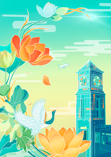 《成信碧源山水图》插画主要以校园代表建筑与山水景观进行结合,体现校园的环境氛围。画面通过学校代表性的钟楼以及图书馆等场景的描绘,体现学校的人文情怀,也展现学校坚持“以人为本,追求卓越”的办学理念,钟楼指针正好指向17:51,代表了建校的1751年。将学校的荷花池及乾坤魂与宋代青瓷碗相结合,体现了中华民族特有的文化精髓和审美情趣。飞行器、飞机、龙泉山脉等一些元素表现了学校大气学科和航空港及龙泉两校区地理位置。整体画面具有一定的视觉效果,展现了优美的校园风采,诠释了优秀的校园文化。