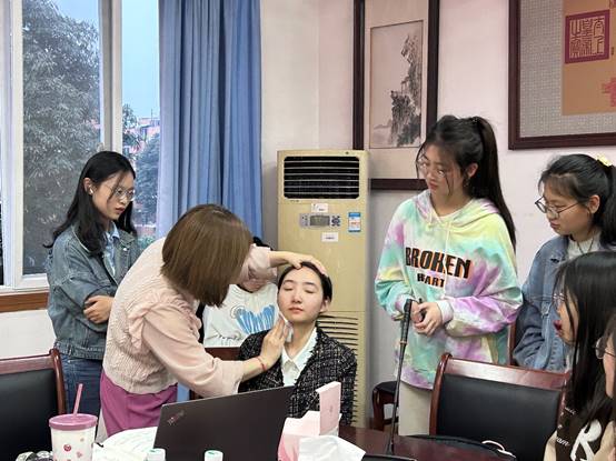 在实操环节,吴老师对现场的一位同学进行了化妆示范教学,在场的同学们兴奋地围坐一旁仔细观察,此次沙龙活动步入高潮。