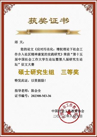 邱天同学的论文《应对污名化:增权理论下社会工作介入社区精神康复的实践研究》获得第十五届中国社会工作大学生论坛第三等奖。