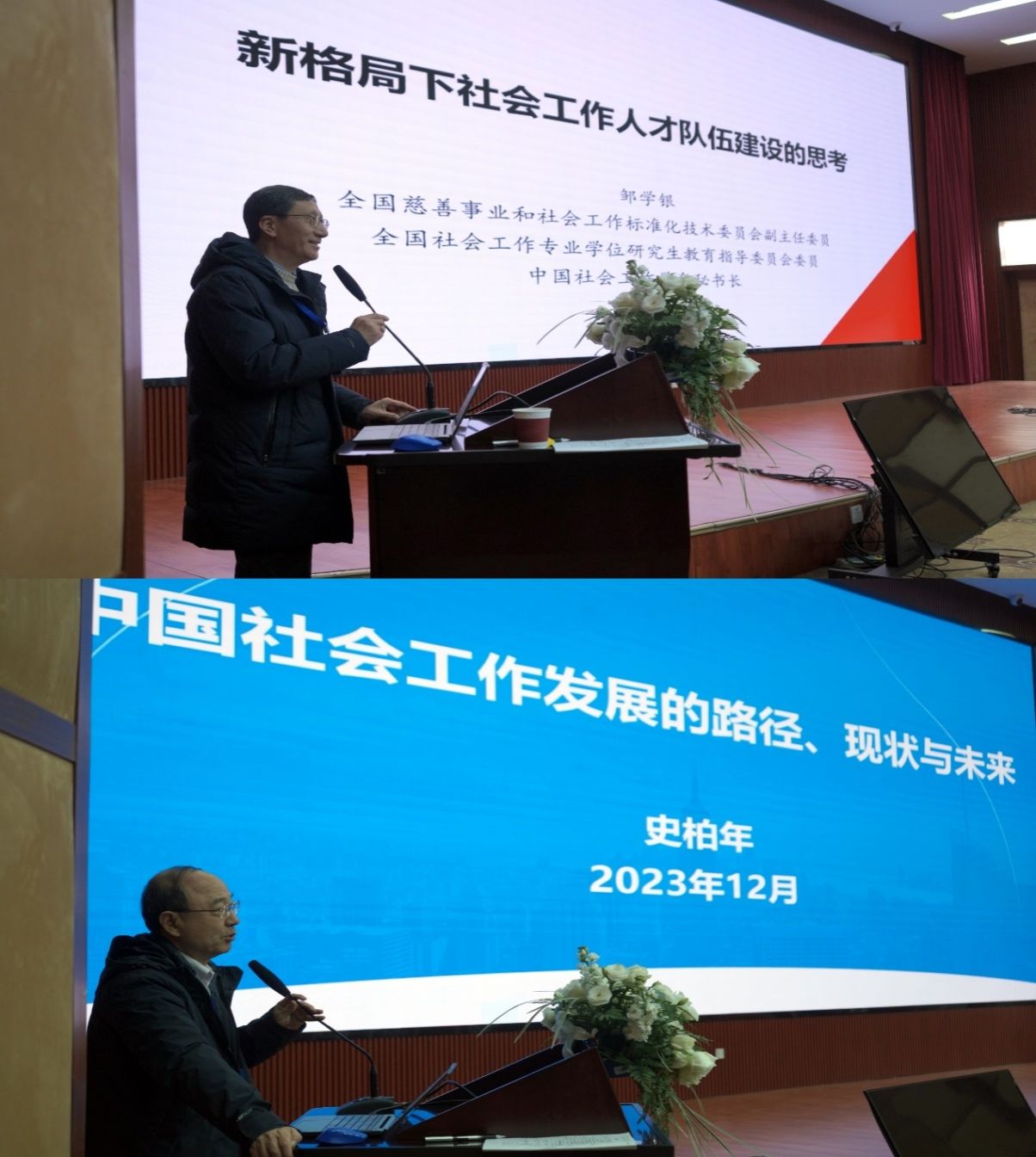 此次会议安排了大会主题报告与平行论坛等学术活动。大会主论坛首先由中国社会工作学会秘书长邹学银教授作了题为“新格局下的社会工作人才队伍建设”的主题报告,邹学银教授提到,要立足新发展阶段思考赋予中国社会工作的时代任务,在新时代新征程中提高社会工作对社会发展的贡献度,助力国家治理体系和治理能力现代化。中国社会工作学会学术委员会主任、教授史柏年作了题为“中国社会工作发展路径现状与未来”的主题报告,提出应及时总结中国社会工作已取得的经验和存在的不足,开启建设与中国式现代化新阶段相适应的中国社会工作建设之路。西南石油大学法学院副院长谭祖雪教授分享了该校的社会工作人才培养实践教学模式。