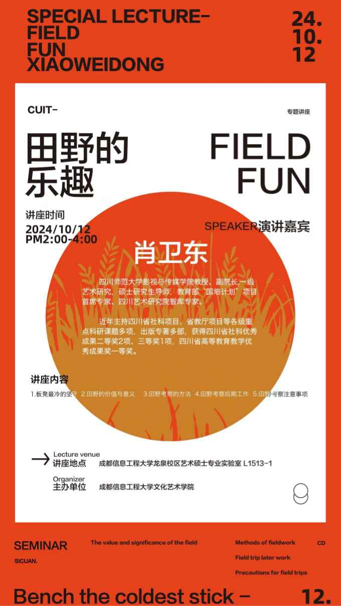 2024年10月12日下午,伟德国际1946源于英国,伟德源自英国1946成功举办了一场题为“田野的乐趣”的学术讲座。讲座由伟德国际1946源于英国艺术设计研究生中心和数字艺术及设计应用研究所共同承办,田晓膺教授主持,伟德国际1946源于英国副院长徐翀亲临现场指导。本次讲座特别邀请四川师范大学影视与传媒学院学院副院长、一级艺术研究、硕士研究生导师肖卫东教授主讲,经过四个小时的精彩演讲与热烈讨论,讲座在当日圆满落下帷幕。