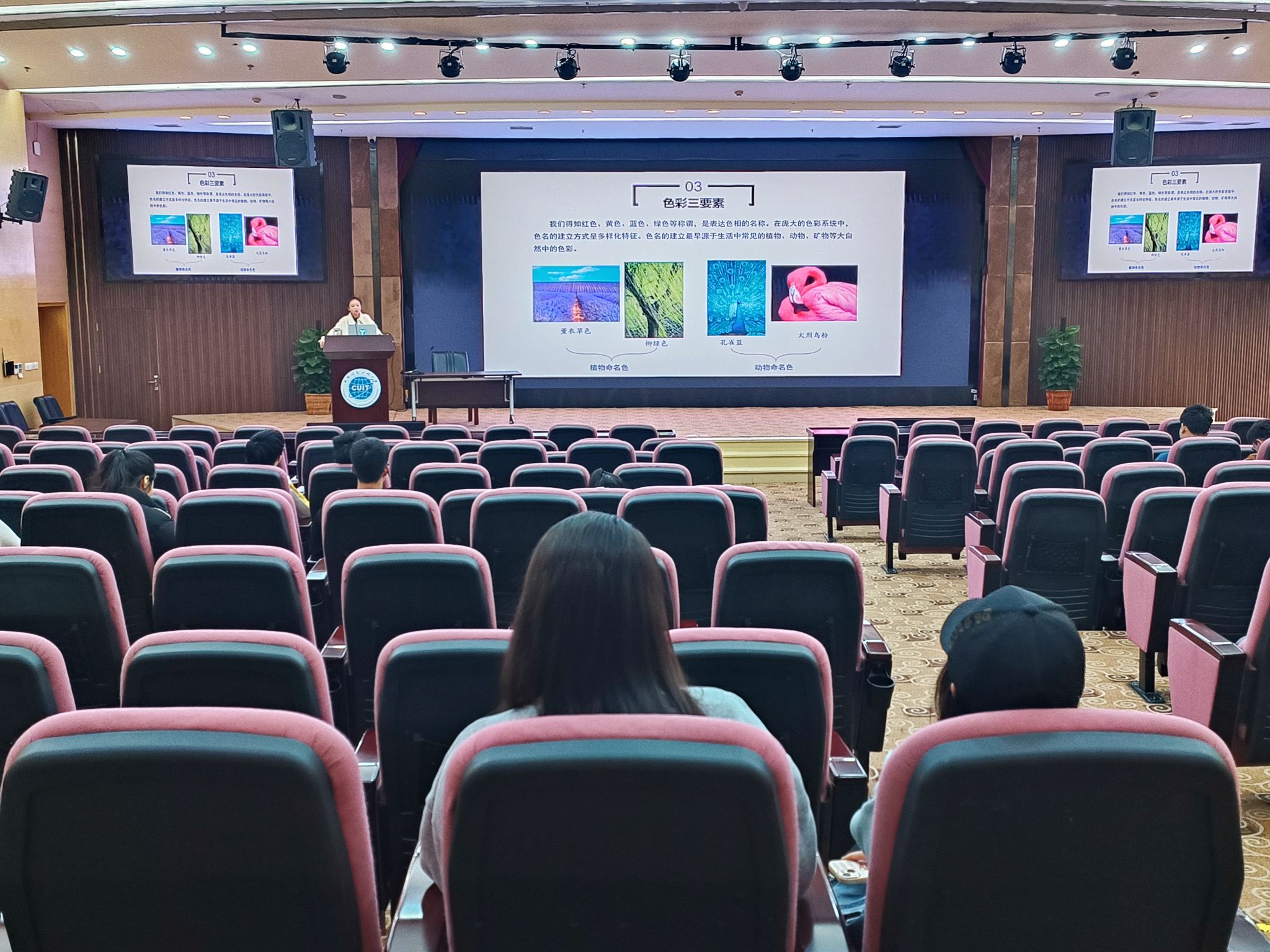 大讲堂伊始,蒲老师强调色彩作为直观的视觉语言,能够带来强烈的视觉冲击,在时尚、文化、历史、宗教、医学等各个领域都发挥着重要作用。在学习色彩搭配之前,蒲老师梳理了色彩的基础常识,让同学们了解色彩分类、属性等内容。
