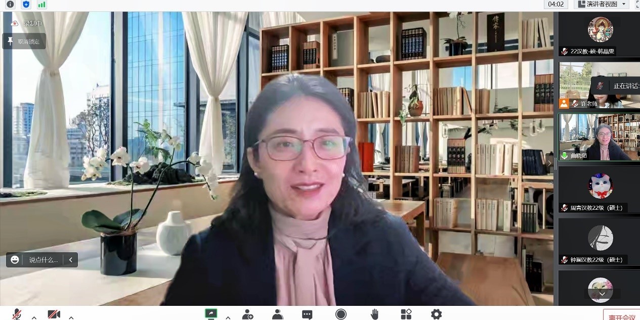 讲座结束后,同学们就讲座内容、研究热点、面向各级水平中文学习者教学设计等进行线上提问。曲晓茹对大家提出的问题均作了详细解答,并鼓励同学们在讲座结束后进行深度交流。