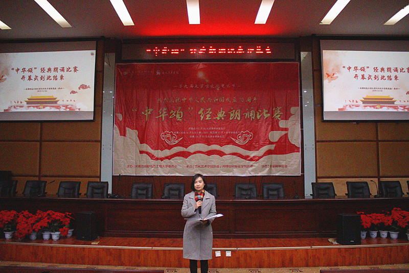 首先,校团委书记丁恒康致词,她提到:中国的经典诗文,博大精深,源远流长,是中华民族文明的重要组成部分。她鼓励同学们要多多学习我国经典文化,丰富自己的精神世界,充实自己的人生,同时预祝本次比赛圆满成功。