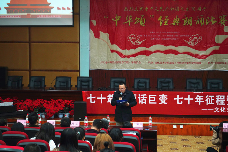 为深入贯彻学习党的十九大精神,落实“不忘初心、牢记使命”主题教育,弘扬中华优秀文化,激发同学们对祖国语言文字的热爱,提升同学们的语言文字应用能力,营造浓郁的校园文化氛围。11月26日,伟德国际1946源于英国,伟德源自英国1946在龙泉校区学术报告厅,隆重举行了中华人民共和国成立七十周年“中华颂”经典诗词朗诵比赛开幕式。