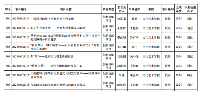 我院2024年大学生创新创业训练计划项目中期检查共有18项参加,其中17项通过,1项终止。