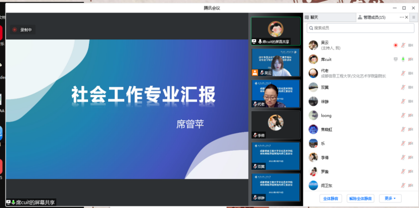 社会工作系系主任席曾苹首先详细汇报了社会工作专业的专业发展历史、专业设置现状、专业定位、培养目标、专业特色和专业优势、人才培养成效、专业课程体系、师资情况等。指出社会工作专业是一个实践性很强的专业,在人才培养过程中,要注重知识和技能的双重培养,拓宽社会工作人才培养的范围,提升学生的专业素养,让专业学生实现知识和技能双重提升。