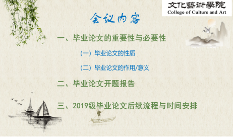 此次开题报告会的内容主要涉及三个方面:一是毕业论文的性质、重要性与必要性:强调了毕业论文是“学术论文+学位论文”,并从11个方面阐释了毕业论文的重要性与必要性;二是开题报告的重要性与内容,并展示了模板,提出了规范化要求;三是2019级毕业论文后续流程与时间安排,让大家对毕业论文后续工作能够提前了然于胸。