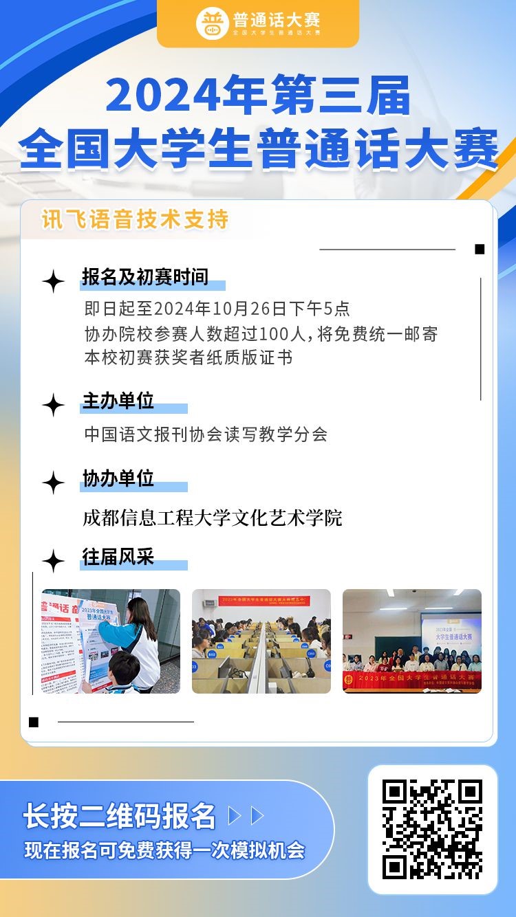 为贯彻《教育部等九部门关于开展第27届全国推广普通话宣传周活动的通知》文件,落实中央领导关于做好推广普及国家通用语言文字工作的重要指示精神,中国语文报刊协会读写教学分会继续面向全国高校大学生举办“2024年第三届全国大学生普通话大赛”。往届大赛有来自北京师范大学、南京师范大学、复旦大学、安徽大学等上千所院校的学生参加,受到了广大高校师生的高度评价。